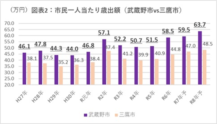 歳出の総額について、市民一人当たりの水準(市民一人当たり歳出額)で比較すると、本市が63.7万円、三鷹市が48.5万円となりました。その差は15.2万円となり、前年の12.5万円から大きく拡大しています(図表2)。