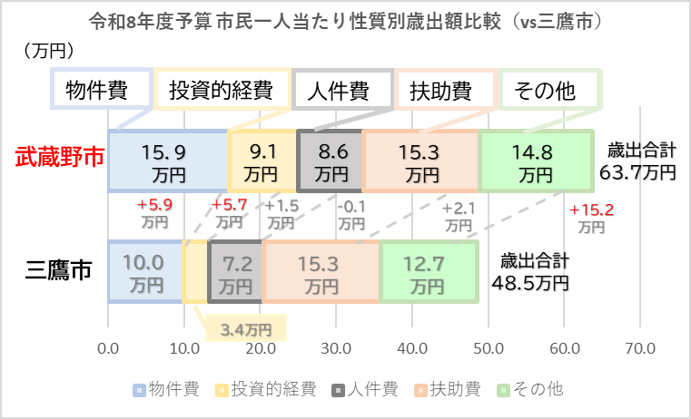 市民一人当たり歳出額の内訳を比較すると、総額では15.2万円の差ではありますが、武蔵野市は三鷹市に比べて性質別では