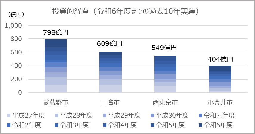 なお、令和6年度までの10年間の投資的経費の状況は下記の表のとおりですが、武蔵野市は798億円(1年あたり平均約80億円)で三鷹市の609億円(1年あたり平均約61億円)よりも大きな水準となっています。市民一人当たりの投資的経費(過去10年間実績)でみると、武蔵野市は53.9万円で三鷹市は31.8万円(1年あたり3.18万円)になります。武蔵野市は、三鷹市の約1.7倍もの水準の税源を公共施設の再整備に投入してきたことになります。