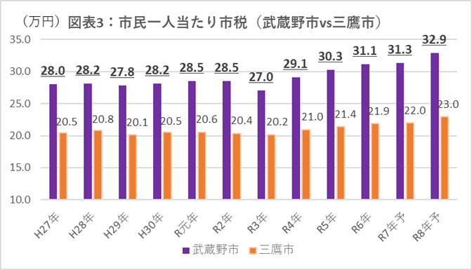 武蔵野市では、担税力の高い市民に支えられ、市税収入は市町村の中でも非常に高い水準にあります。市民一人当たりの市税額は32.9万円で、三鷹市(23.0万円)より9.9万円多い状況です。