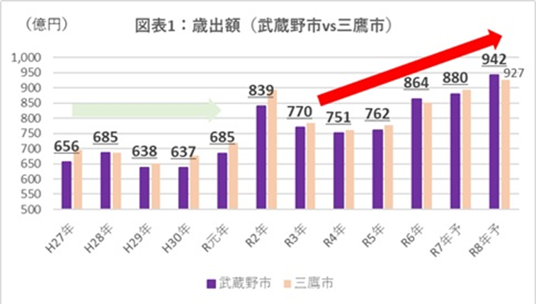 ① 令和8年度予算規模~武蔵野市は三鷹市よりも人口は少ないにもかかわらず、歳入・歳出の規模は武蔵野市の方が三鷹市より大きい