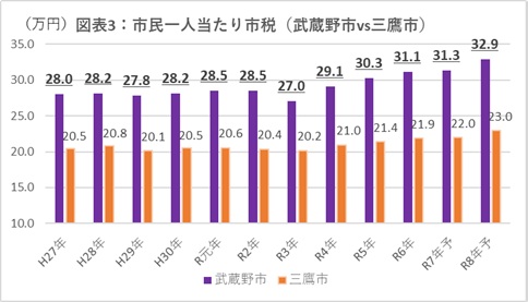 令和8年度予算における市民一人当たりの市税額を見ると、本市は32.9万円であるのに対し、三鷹市は23.0万円であり、その差は9.9万円となっている。(図表3参照)