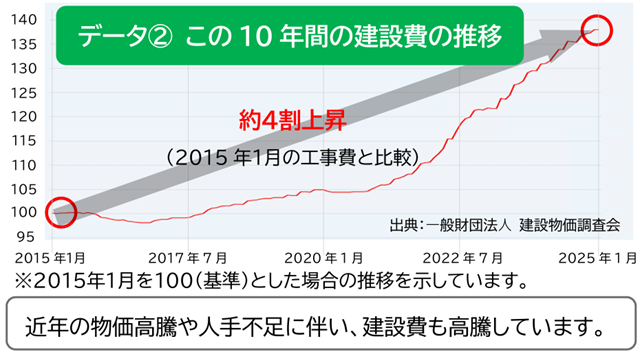 下の図表は、武蔵野市教育委員会が作成した資料の一部を抜粋したものですが、そこでは建設費が10年前と比べて約4割上昇していることが示されています。